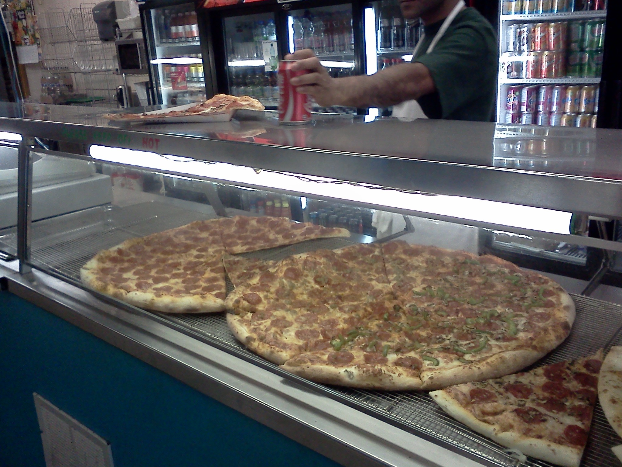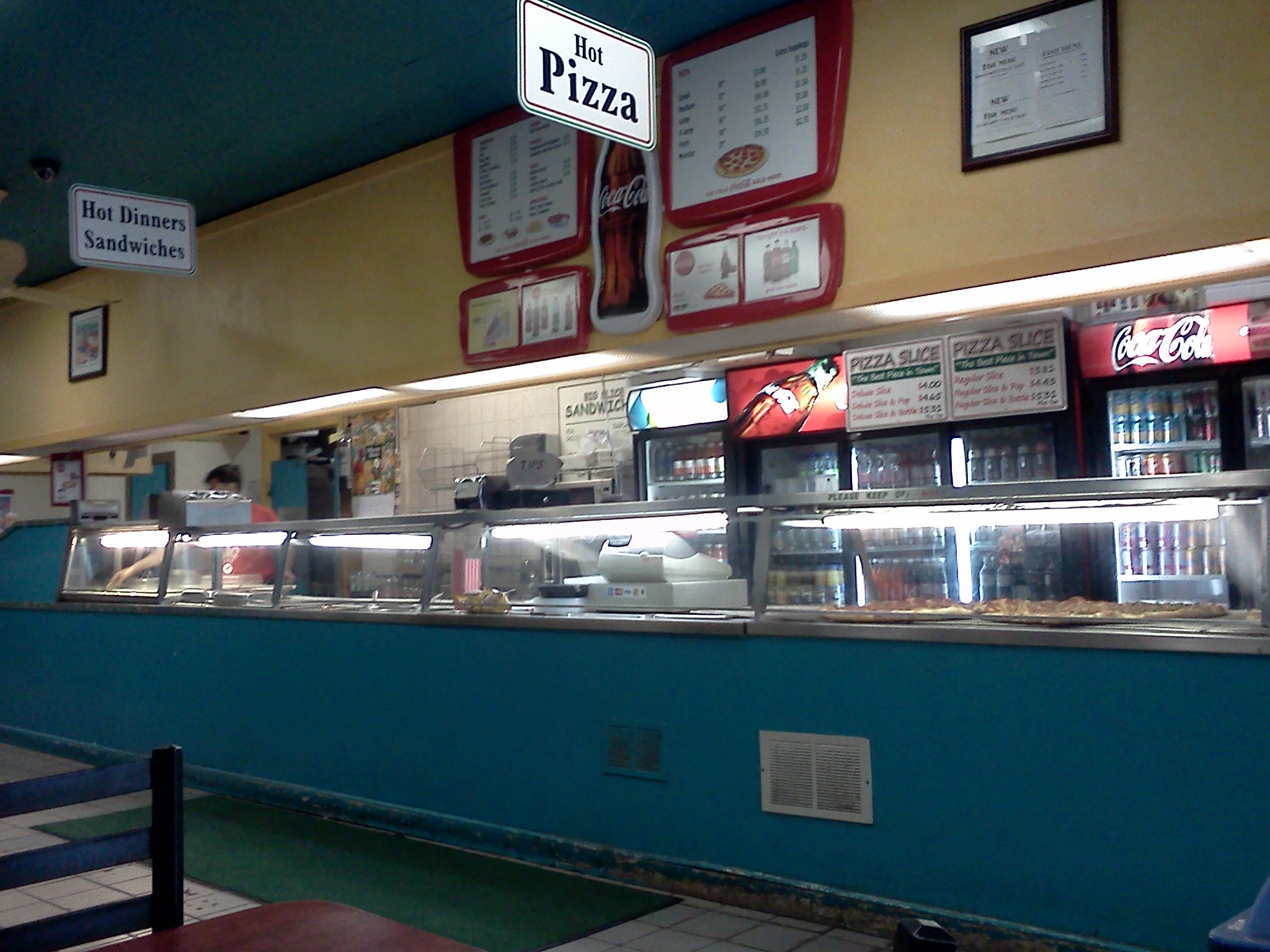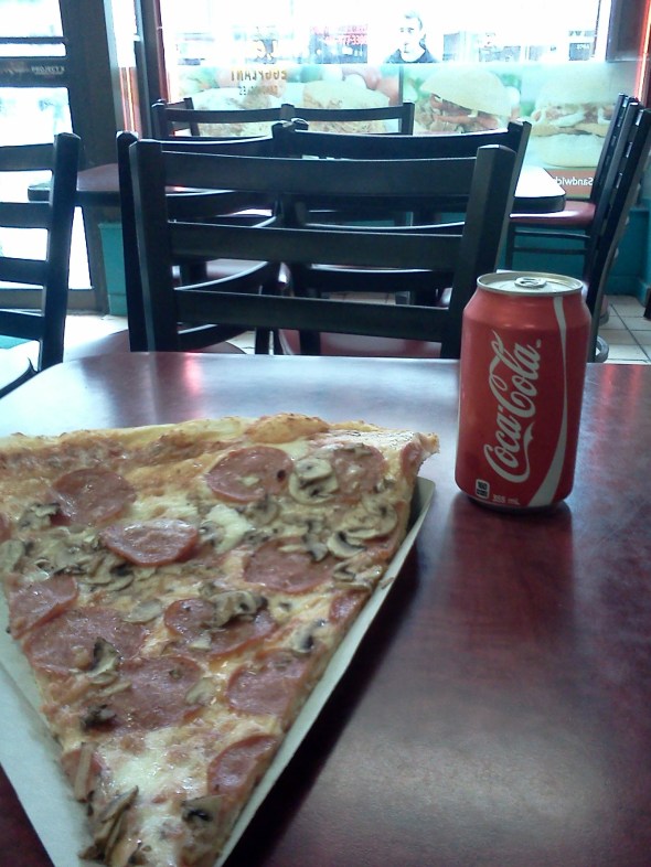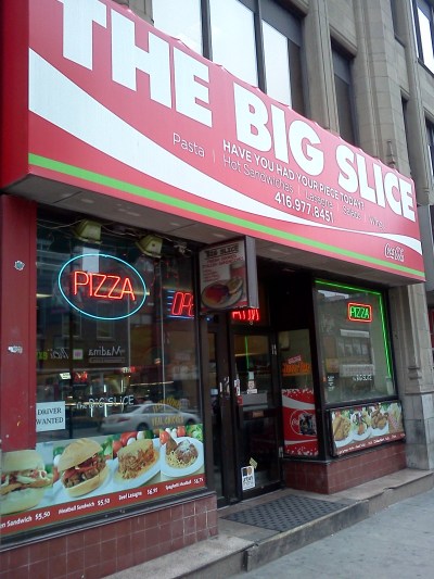 Fast forward 25 yrs later and I’m still eating THE BIG SLICE.  It has become a Toronto staple for me.  When Im in town and I need a quick bite to eat, nothing tempts me more than going for a quick slice of premium pizza (note:  this is not gourmet pizza or gluten free pizza or organic pizza or any other lovey dovey term of the day), simply pizza. And it is good.  It was good then and it has been good ever since, including yesterday.  The pizza is still spun by hand in the front window, toppings generously added by feel – not by scale and weight.   The counters, tables, chairs, and paintings on the walls – all remain the same. Dance music of the day played over the decrepit radio shack speakers – wires still unattached to the walls – a five minute job that could have been done decades ago.  Until recently Ive not taken notice of how long Ive been eating at The Big Slice and how long things there have just remained the way they were.  Continually I still order peperoni/mushroom and a can of coke.  The cost today is five bucks tax incl. Pizza, Big, Cheap.  I was thinking to myself that maybe it’s the nostalgia, maybe the feeling of returning to a different time – young, innocent, free – or maybe Im just stuck in my ways, and this the reason I keep going back.  I mean Im not with my buddy like the good old days  – who has long since moved to Asia  – nor going to a hockey game……..nor there avoiding bed time and homework. But I am there for some reason besides just being hungry.